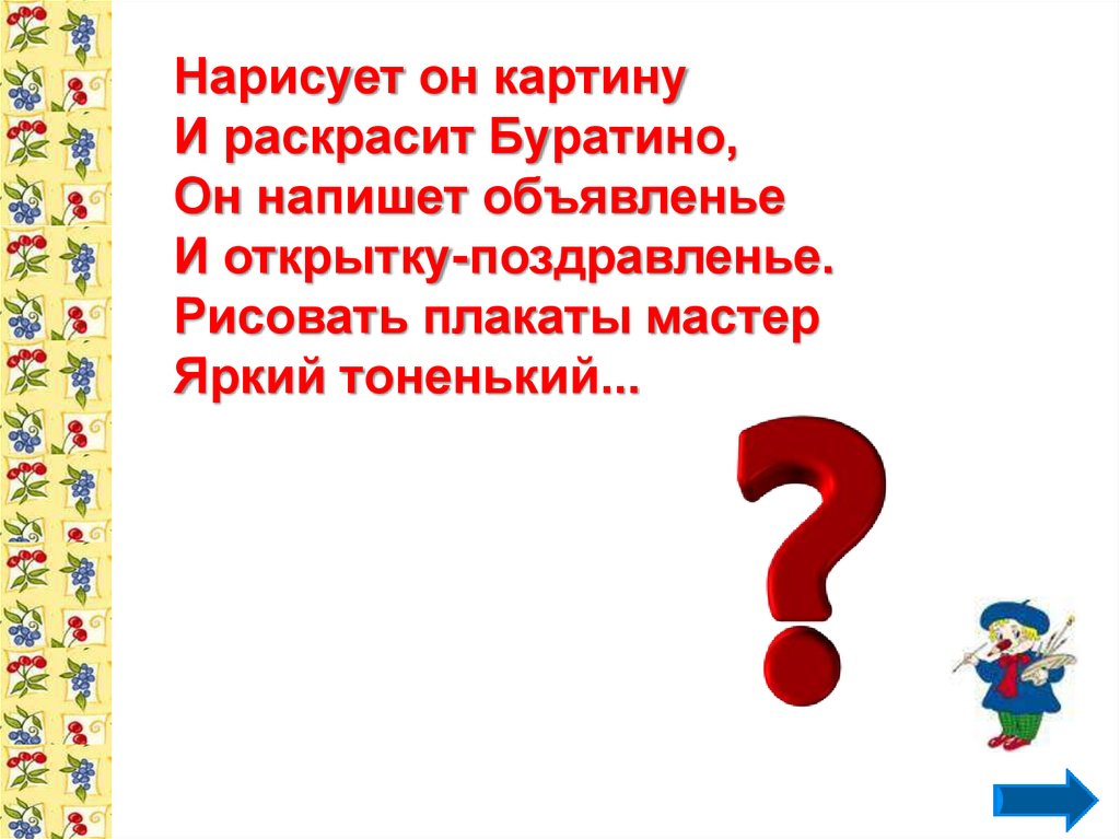Нарисует он картинуИ раскрасит Буратино,