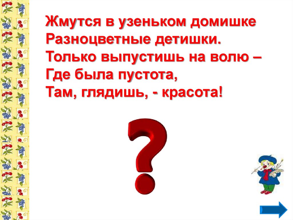 Жмутся в узеньком домишкеРазноцветные детишки.
