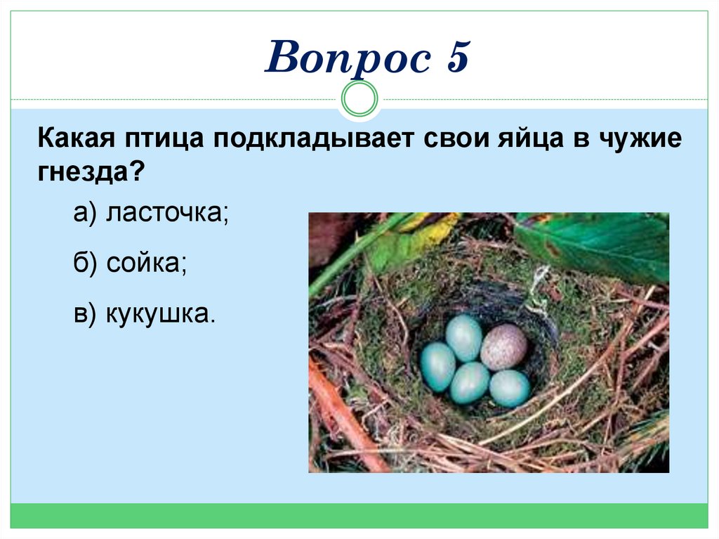 Вопрос 5Какая птица подкладывает свои яйца в чужие