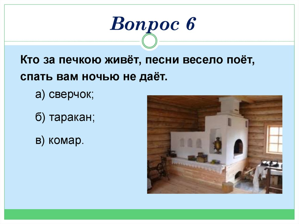 Вопрос 6Кто за печкою живёт, песни весело поёт,