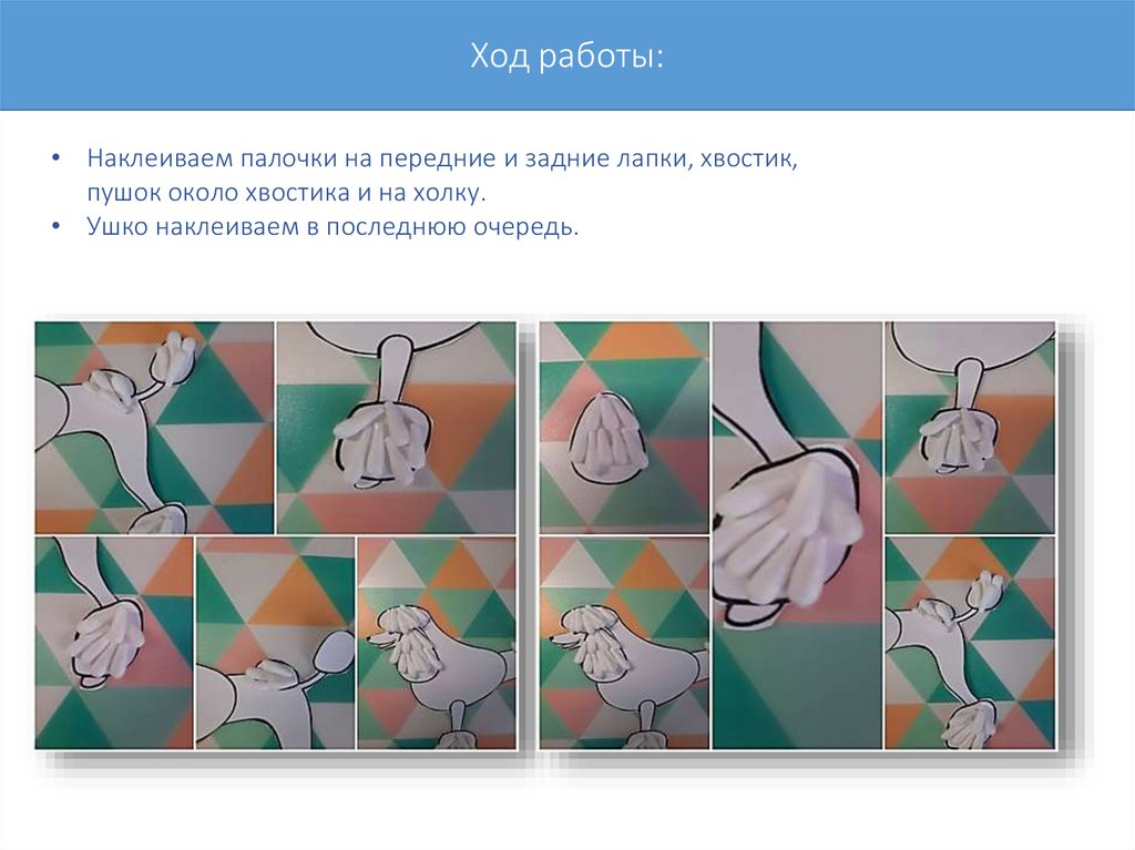 Ход работы:• Наклеиваем палочки на передние и задние лапки, хвостик,