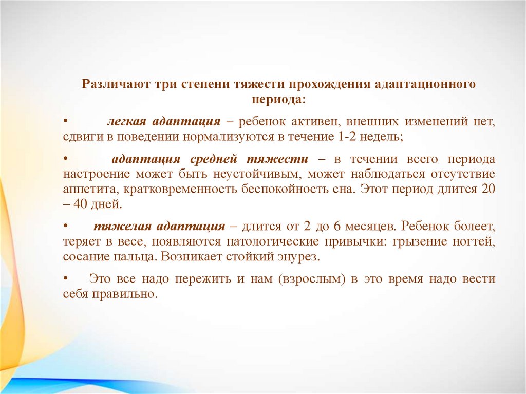 легкая адаптация – ребенок активен, внешних изменений нет,