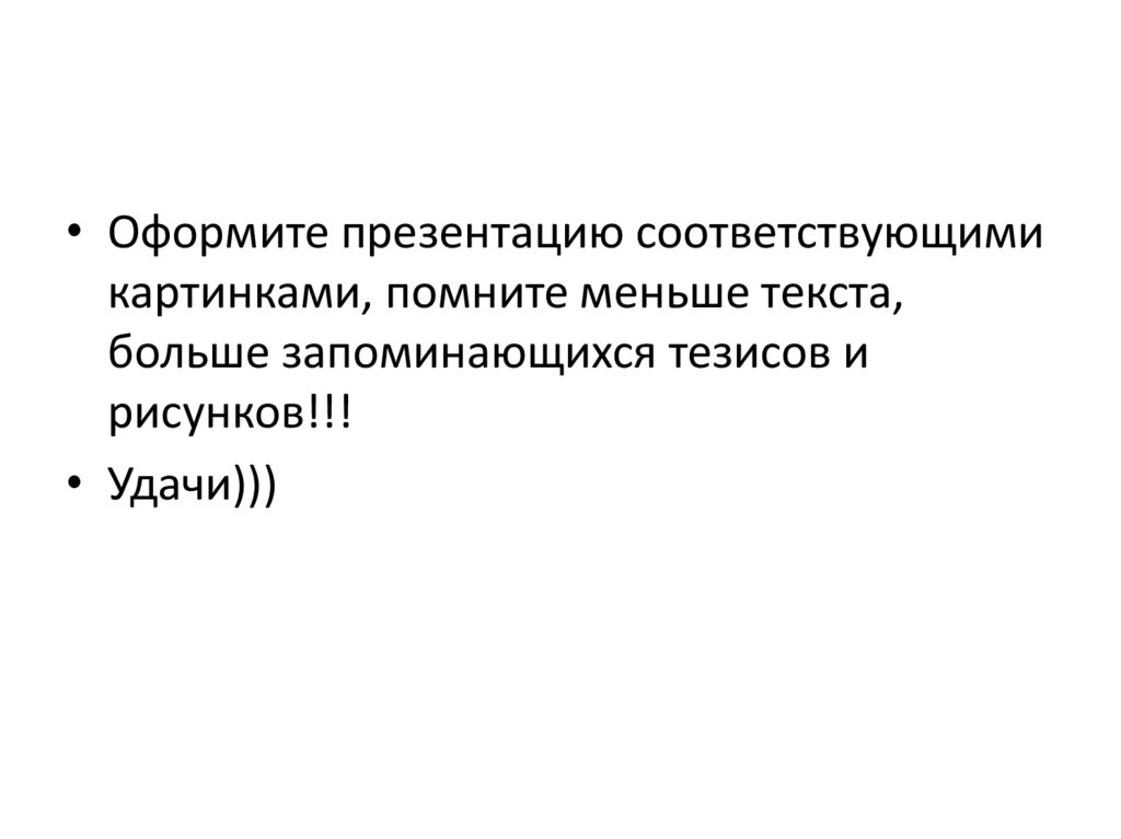 • Оформите презентацию соответствующимикартинками, помните меньше текста,