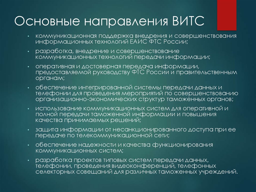 позволяет организовать интегрированную передачу разнородного мультимедийного трафика, включая передачу данных, голоса и видеоинформации. ВИТС создается на базе существующей в ФТС России
