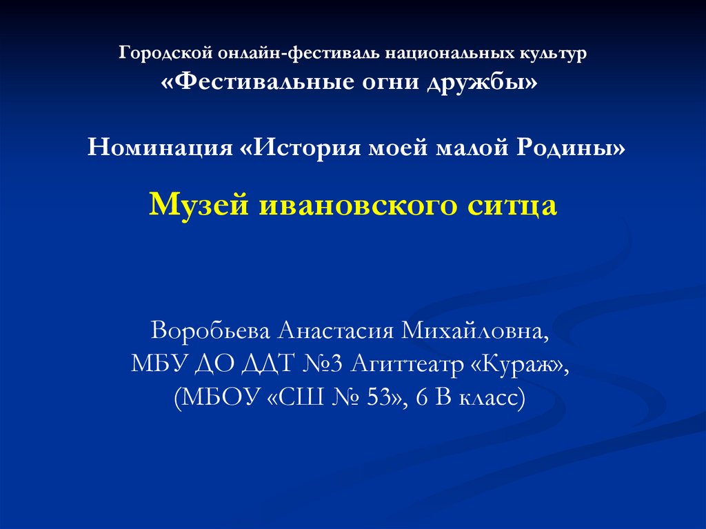 1. Городской онлайн-фестиваль национальных культур «Фестивальные огни дружбы» Номинация «История моей малой Родины» Музей