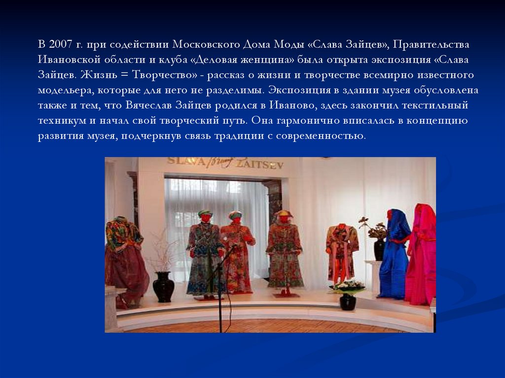 В 2007 г. при содействии Московского Дома Моды «Слава Зайцев», ПравительстваИвановской области и клуба «Деловая женщина» была открыта экспозиция «Слава