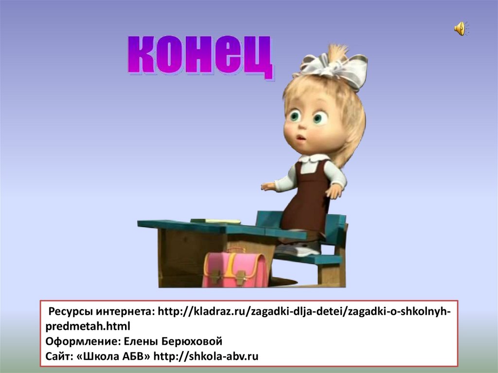 Ресурсы интернета: http://kladraz.ru/zagadki-dlja-detei/zagadki-o-shkolnyhpredmetah.htmlОформление: Елены Берюховой