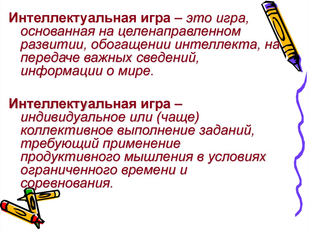 Интеллектуальная игра – это игра,основанная на целенаправленном