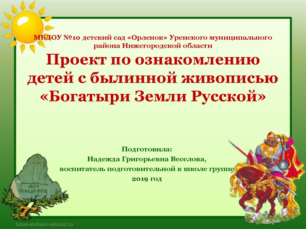 1. МБДОУ №10 детский сад «Орленок» Уренского муниципального района Нижегородской области Проект по ознакомлению детей с былинной