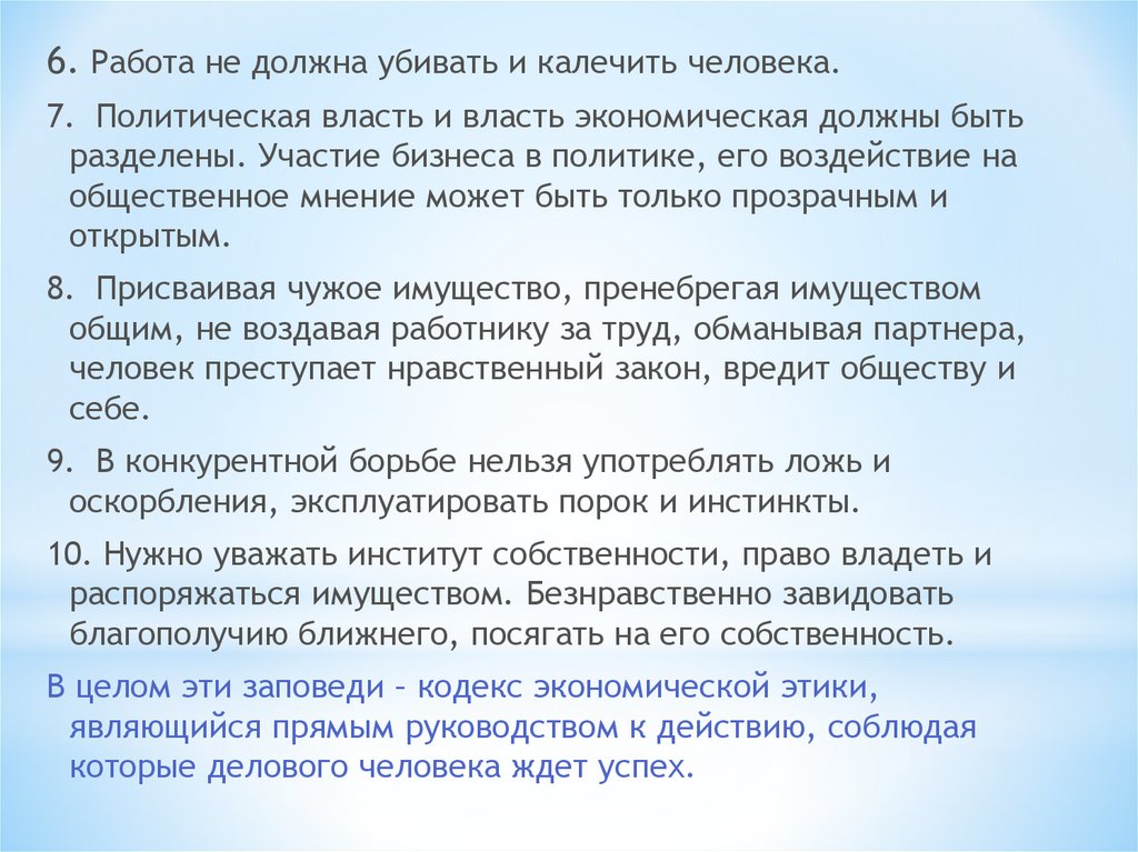 6. Работа не должна убивать и калечить человека.7. Политическая власть и власть экономическая должны быть