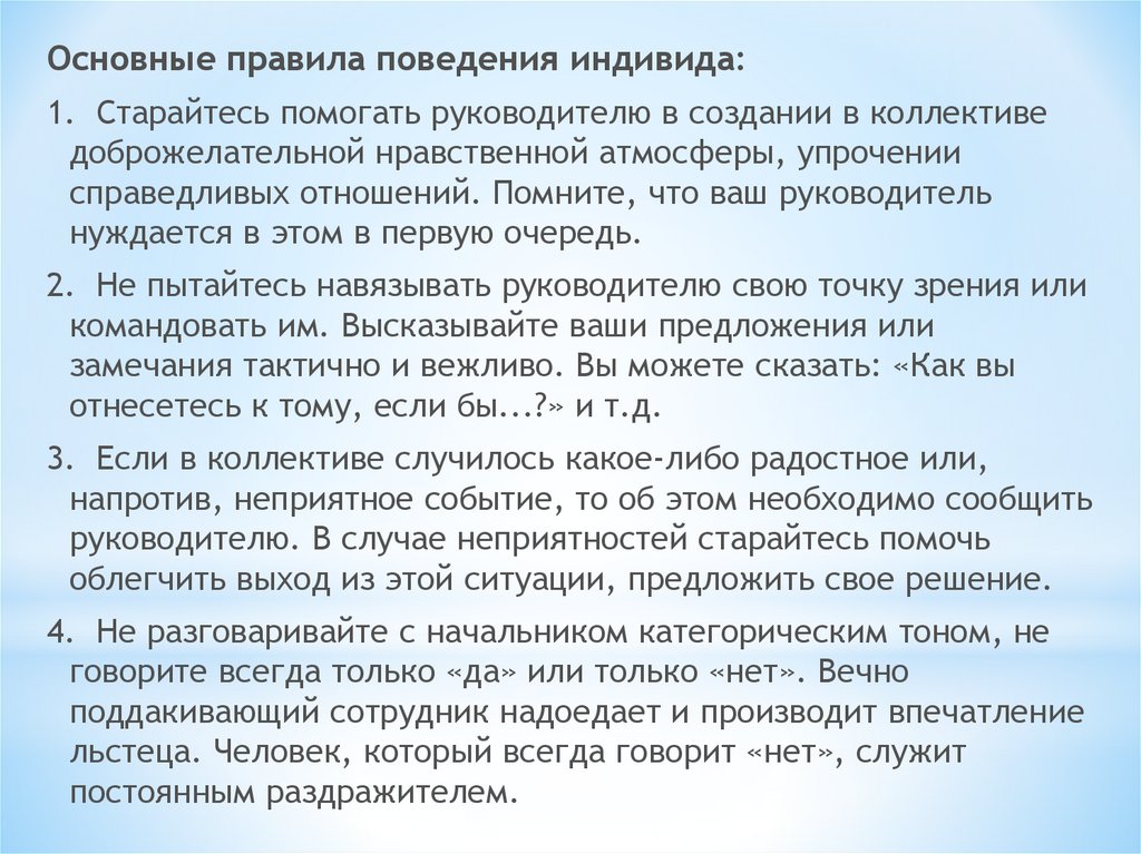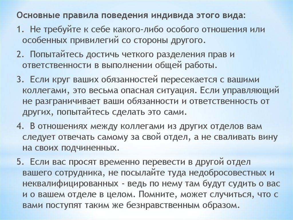Основные правила поведения индивида этого вида:1. Не требуйте к себе какого-либо особого отношения или