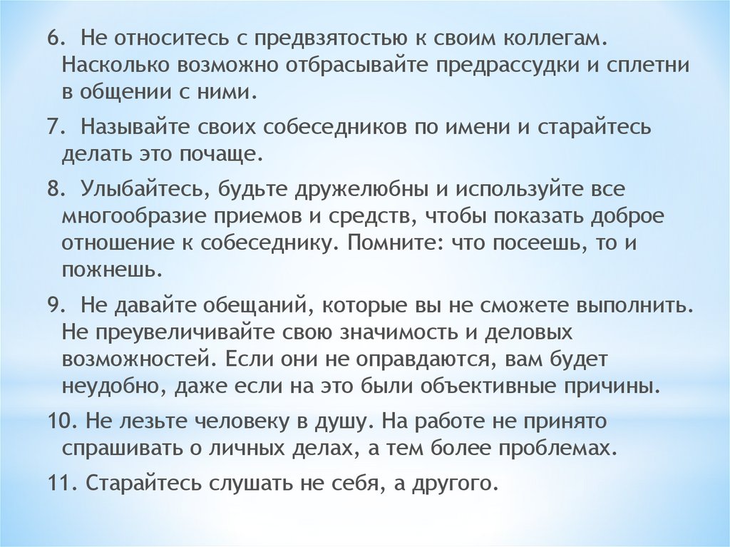 6. Не относитесь с предвзятостью к своим коллегам.Насколько возможно отбрасывайте предрассудки и сплетни