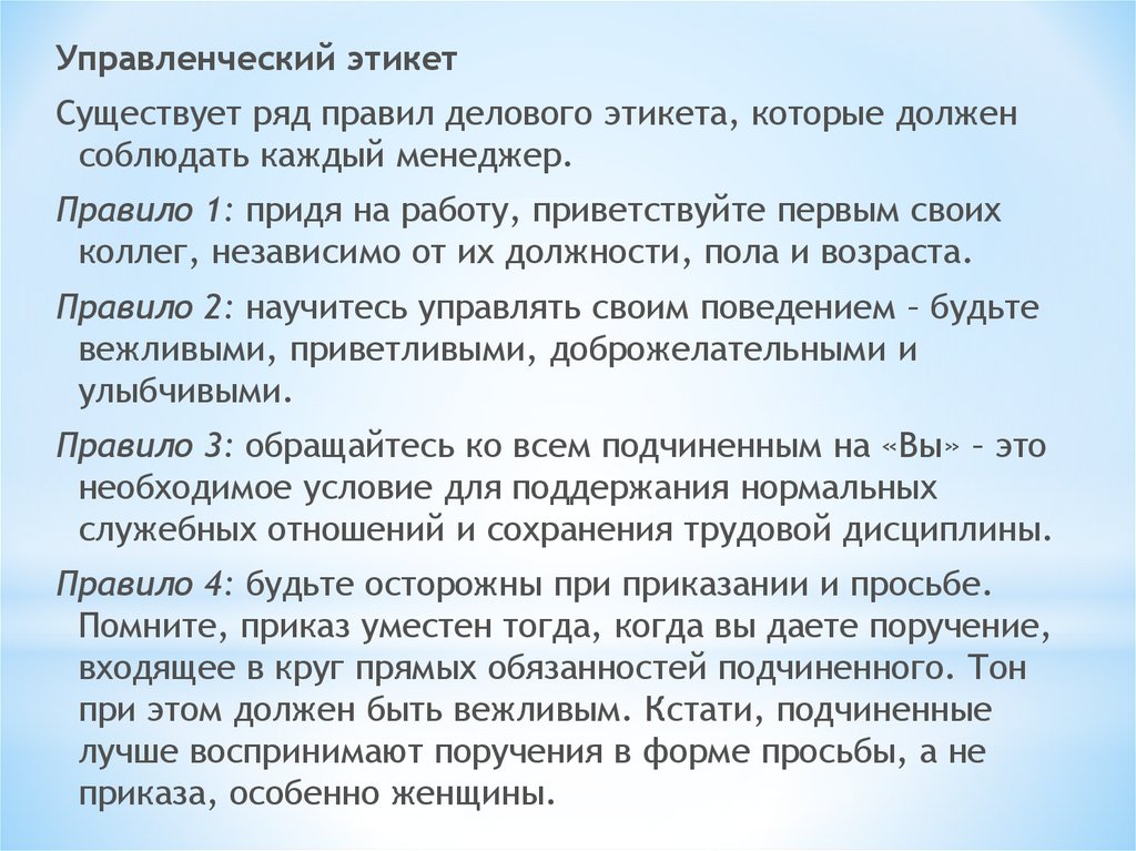 Управленческий этикетСуществует ряд правил делового этикета, которые должен