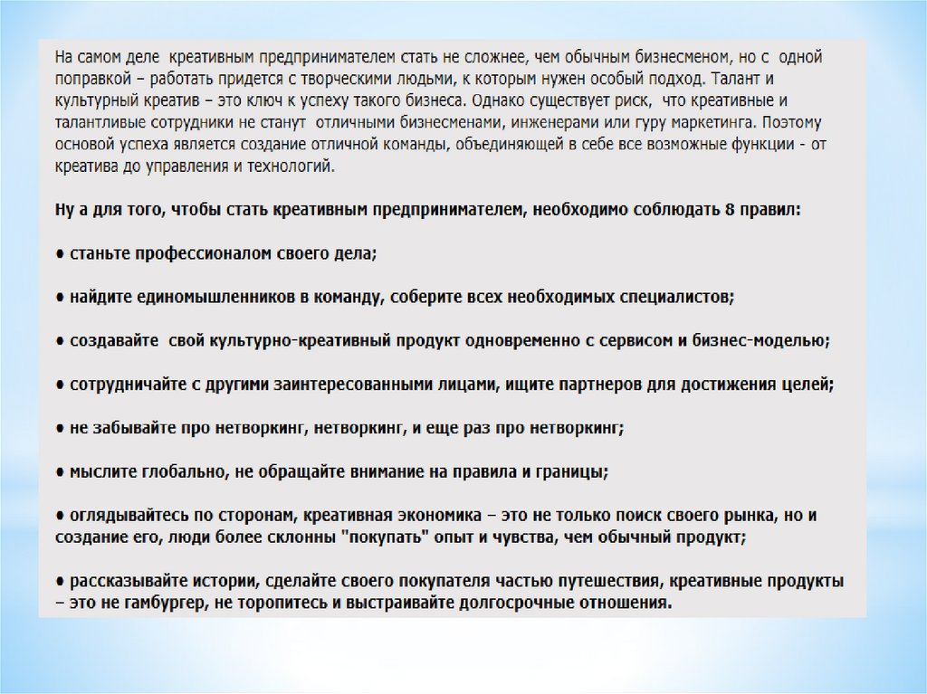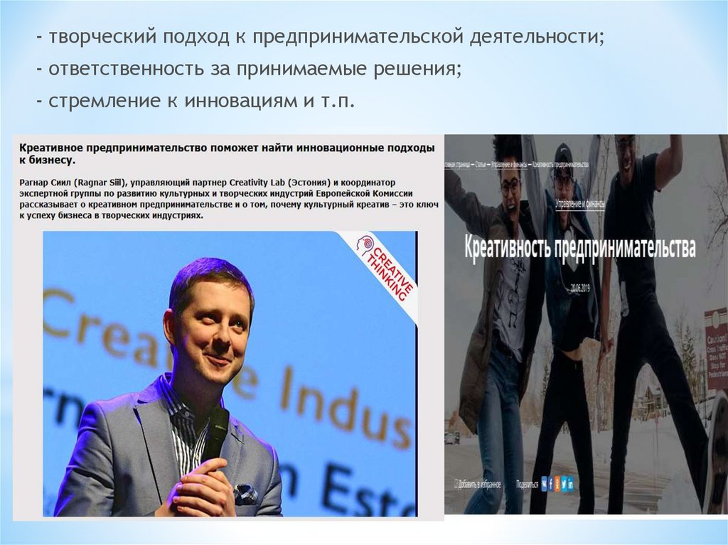 - творческий подход к предпринимательской деятельности;- ответственность за принимаемые решения;