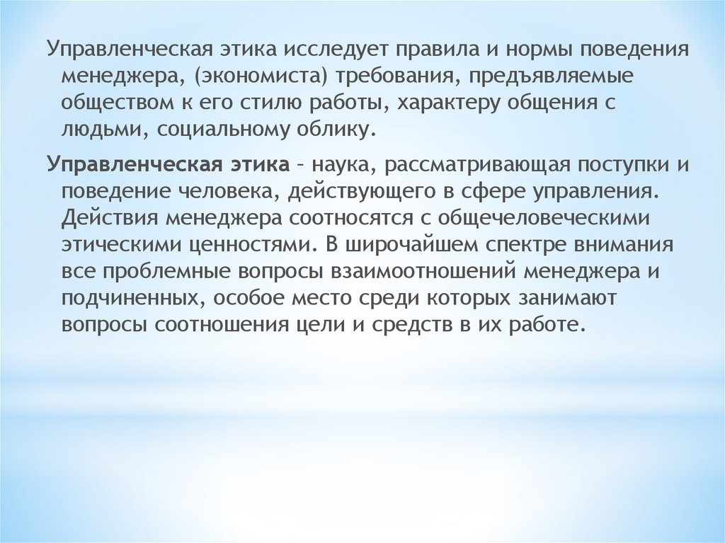 Управленческая этика исследует правила и нормы поведенияменеджера, (экономиста) требования, предъявляемые