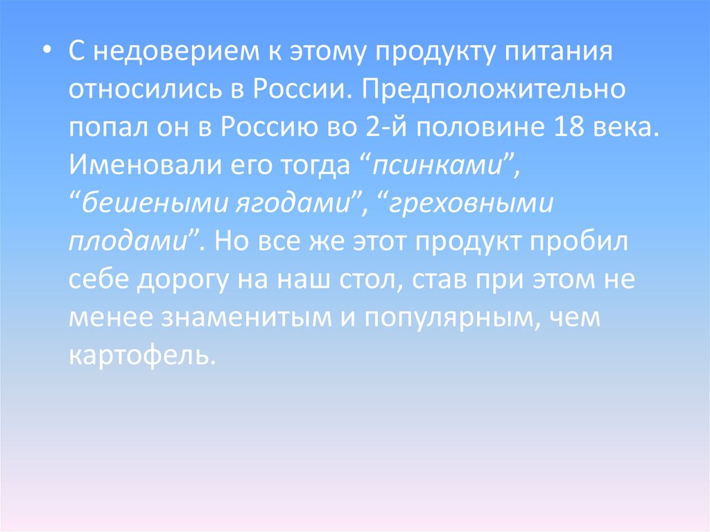 • С недоверием к этому продукту питанияотносились в России. Предположительно