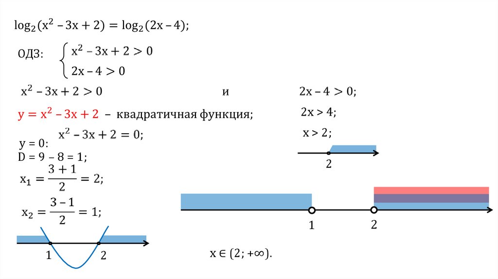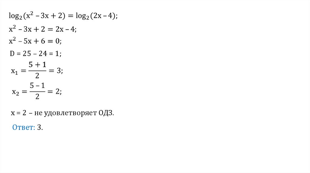 D = 25 – 24 = 1;х = 2 – не удовлетворяет ОДЗ.