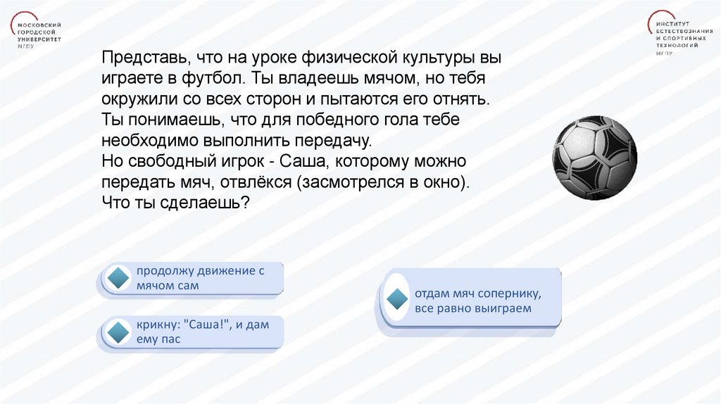 Представь, что на уроке физической культуры выиграете в футбол. Ты владеешь мячом, но тебя