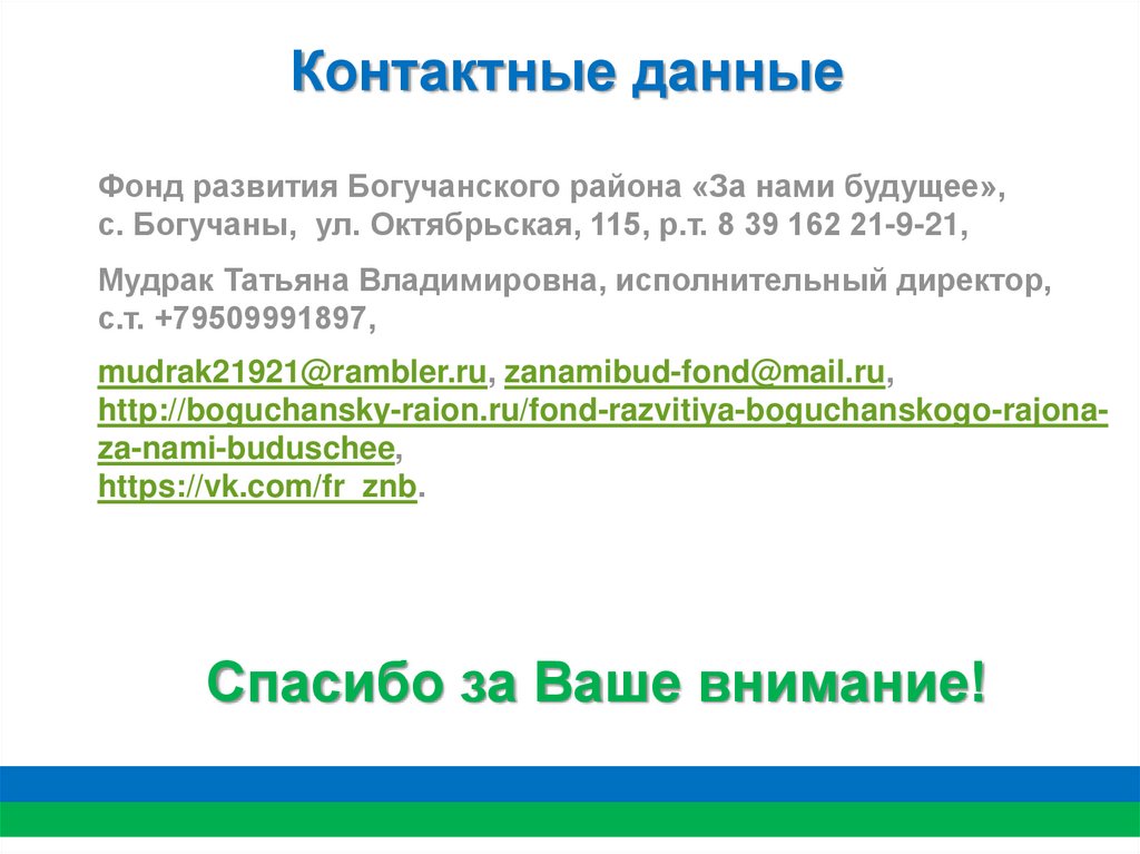 Контактные данныеФонд развития Богучанского района «За нами будущее»,