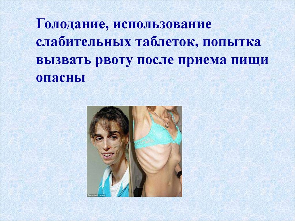 Голодание, использованиеслабительных таблеток, попытка