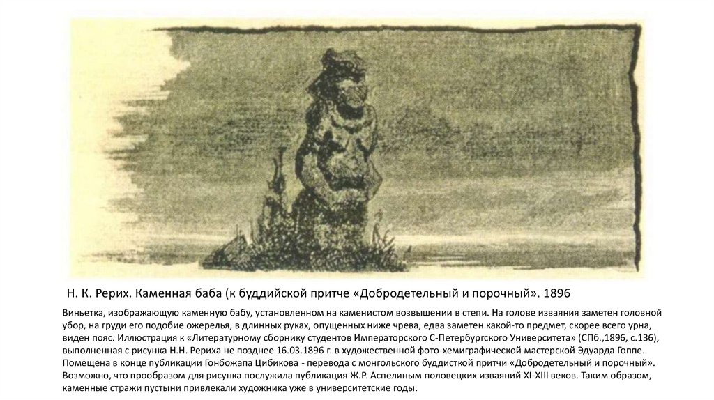Н. К. Рерих. Каменная баба (к буддийской притче «Добродетельный и порочный». 1896Виньетка, изображающую каменную бабу, установленном на каменистом возвышении в степи. На голове изваяния заметен головной