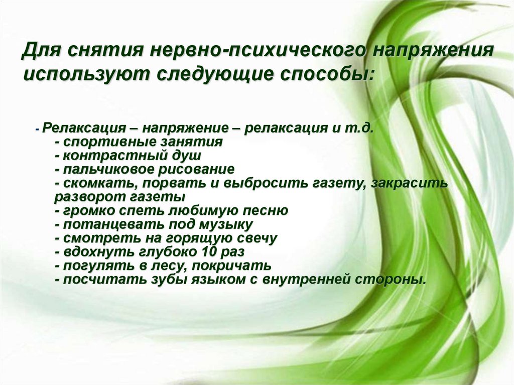 Для снятия нервно-психического напряженияиспользуют следующие способы: