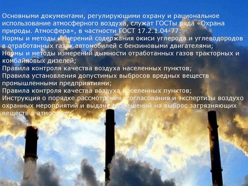 Основными документами, регулирующими охрану и рациональноеиспользование атмосферного воздуха, служат ГОСТы ряда «Охрана