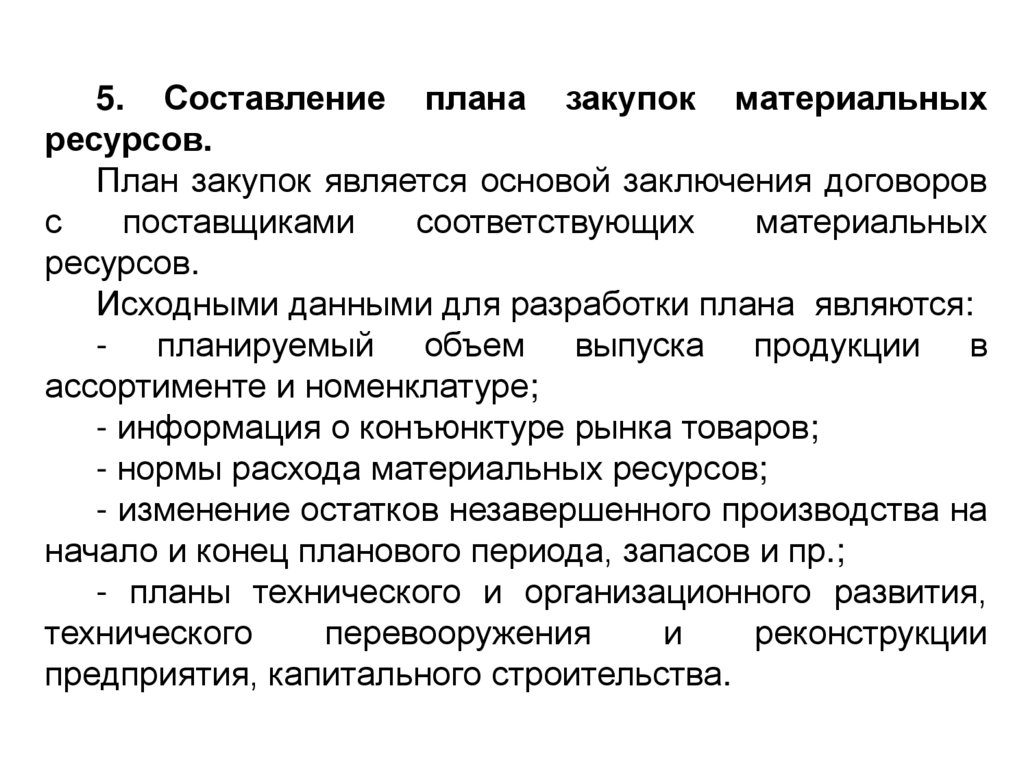 5. Составление плана закупок материальныхресурсов.