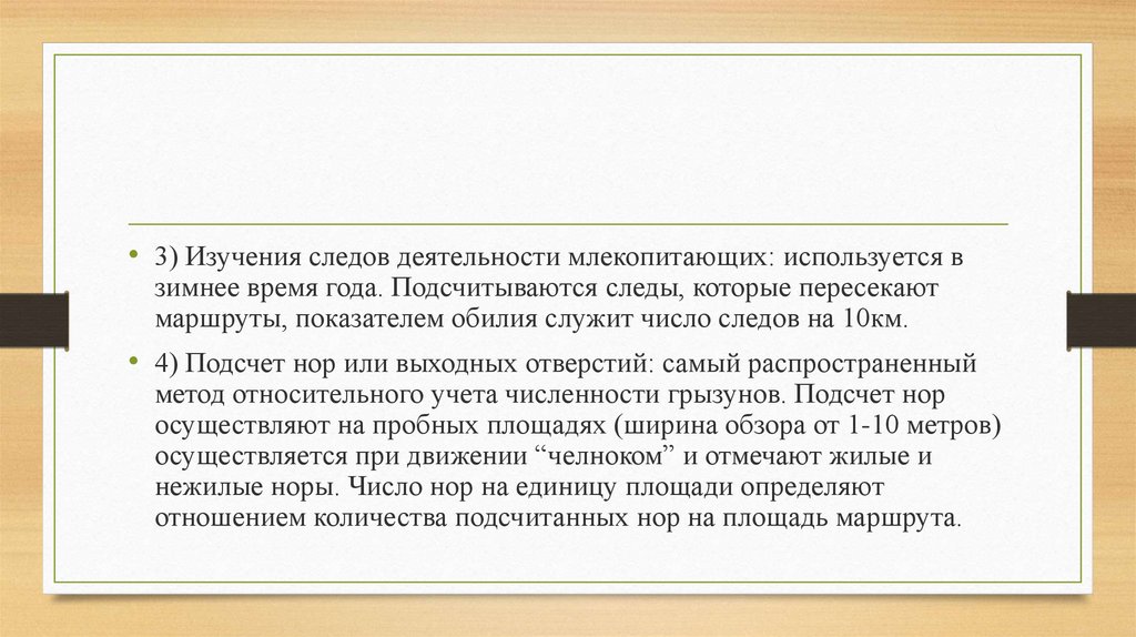 • 3) Изучения следов деятельности млекопитающих: используется взимнее время года. Подсчитываются следы, которые пересекают
