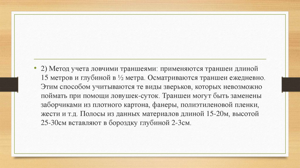 • 2) Метод учета ловчими траншеями: применяются траншеи длиной15 метров и глубиной в ½ метра. Осматриваются траншеи ежедневно.
