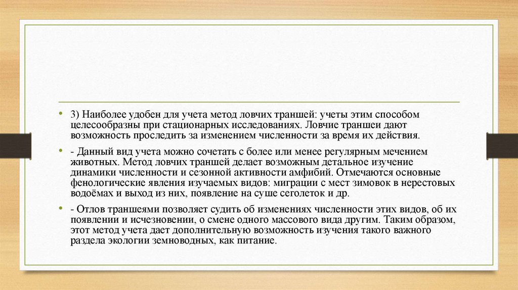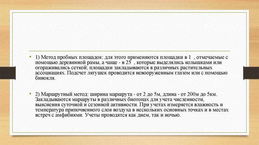 • 1) Для учета земноводных и пресмыкающихся используется подсчет встречна маршруте, отлов траншеями, подсчет икринок кладки, числа кладок.