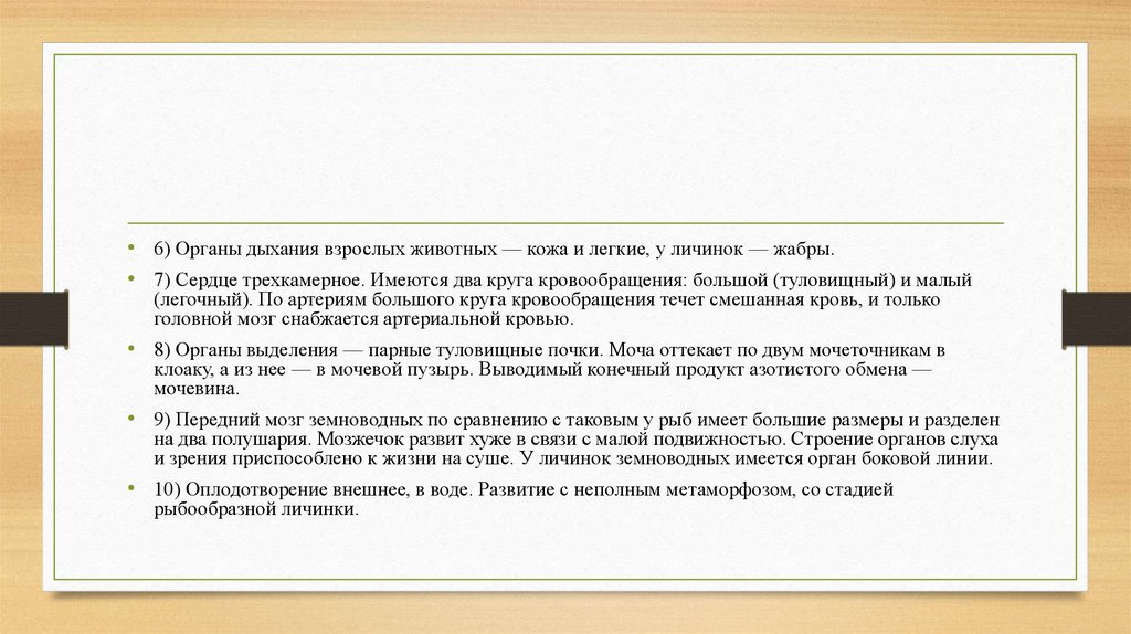 • 6) Органы дыхания взрослых животных — кожа и легкие, у личинок — жабры.• 7) Сердце трехкамерное. Имеются два круга кровообращения: большой (туловищный) и малый
