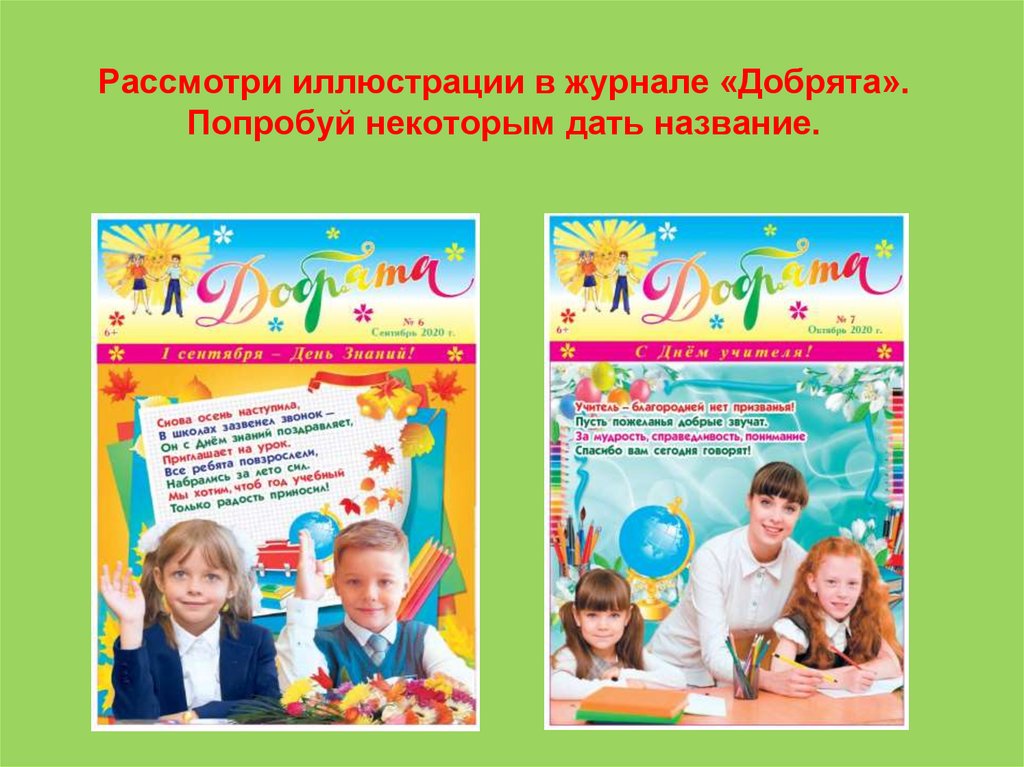 Рассмотри иллюстрации в журнале «Добрята».Попробуй некоторым дать название.
