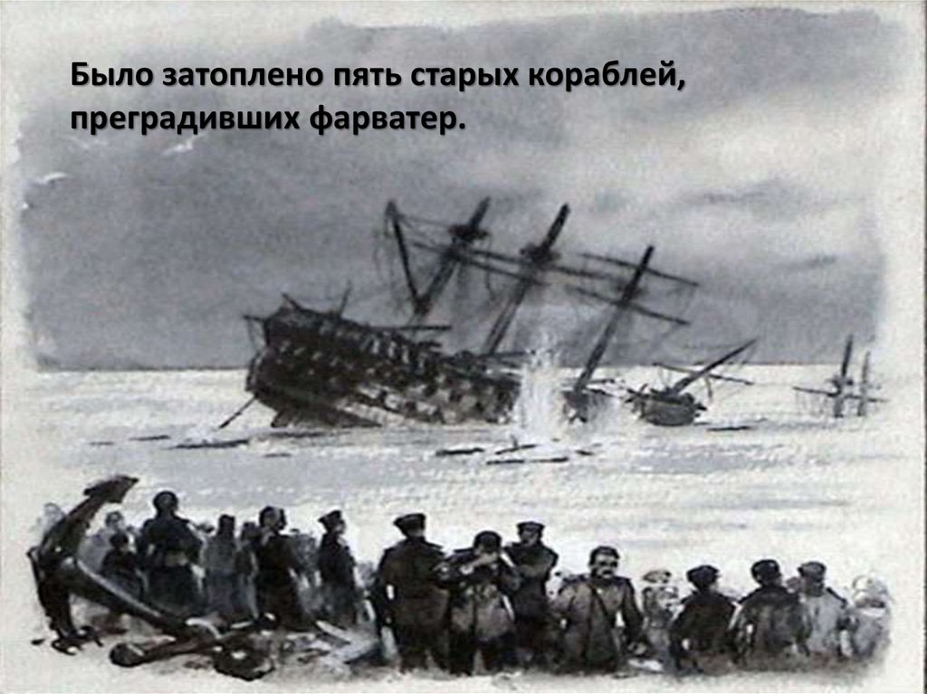 Было затоплено пять старых кораблей,преградивших фарватер.