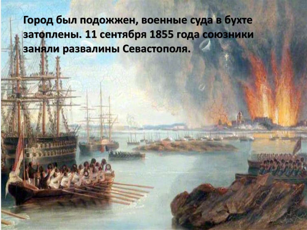 Город был подожжен, военные суда в бухтезатоплены. 11 сентября 1855 года союзники