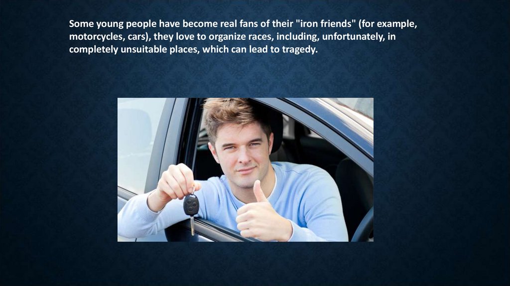 Some young people have become real fans of their "iron friends" (for example,motorcycles, cars), they love to organize races, including, unfortunately, in