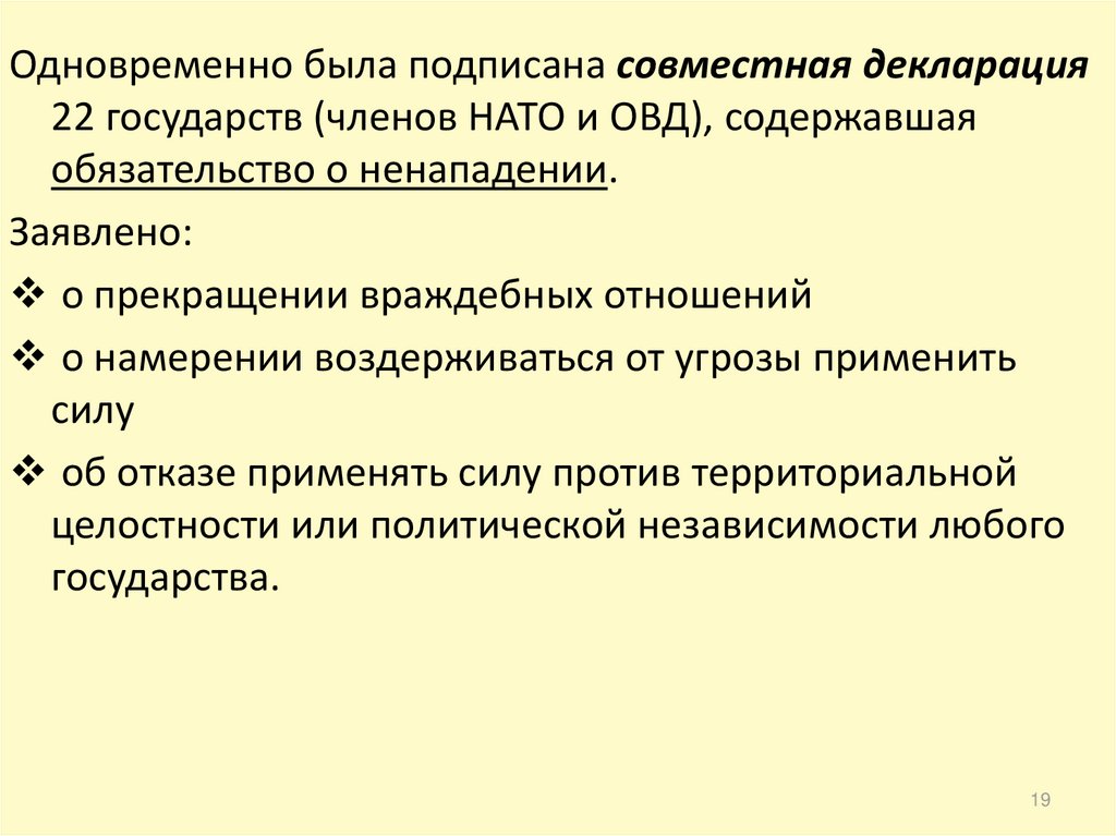 Одновременно была подписана совместная декларация22 государств (членов НАТО и ОВД), содержавшая