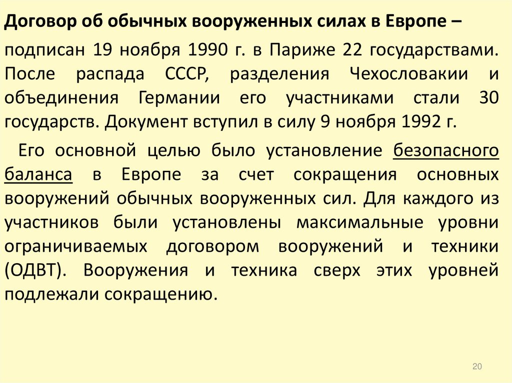 Договор об обычных вооруженных силах в Европе –подписан 19 ноября 1990 г. в Париже 22 государствами.