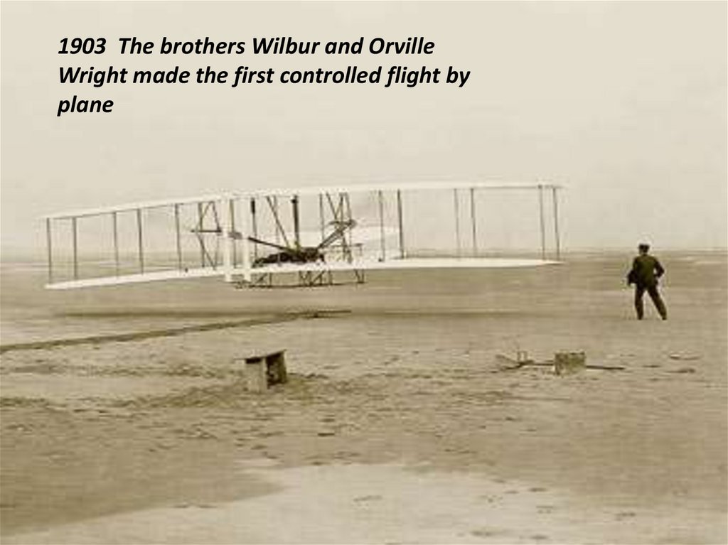 1903 The brothers Wilbur and OrvilleWright made the first controlled flight by