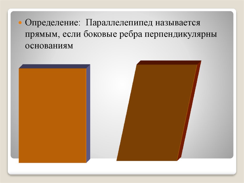 Определение: Параллелепипед называетсяпрямым, если боковые ребра перпендикулярны