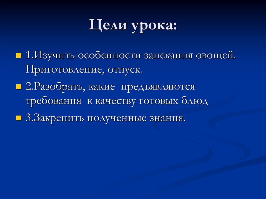 Цели урока:1.Изучить особенности запекания овощей.