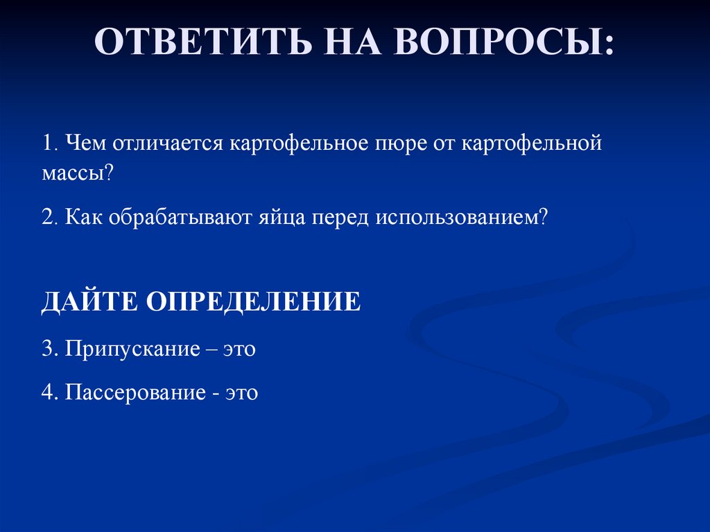 ОТВЕТИТЬ НА ВОПРОСЫ:1. Чем отличается картофельное пюре от картофельной