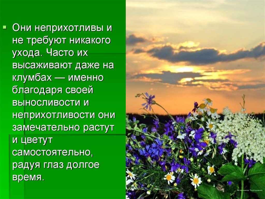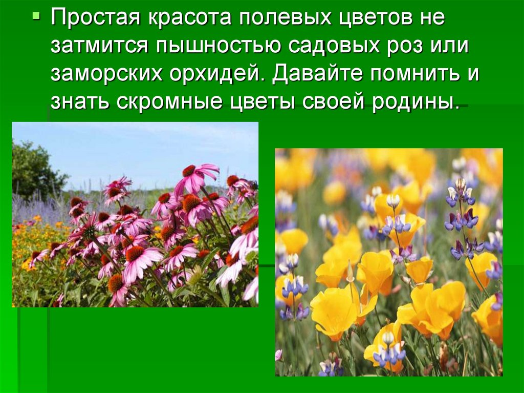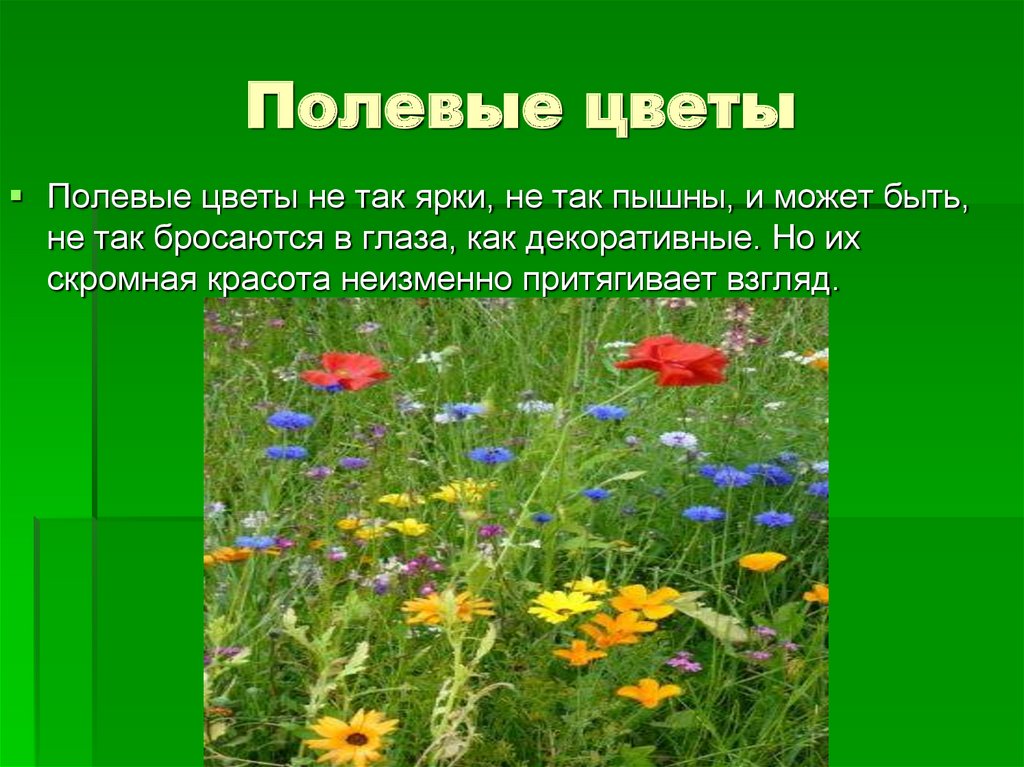 Полевые цветы не так ярки, не так пышны, и может быть,не так бросаются в глаза, как декоративные. Но их