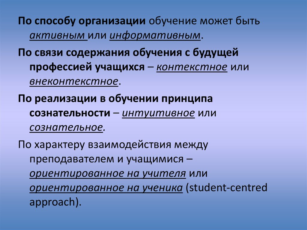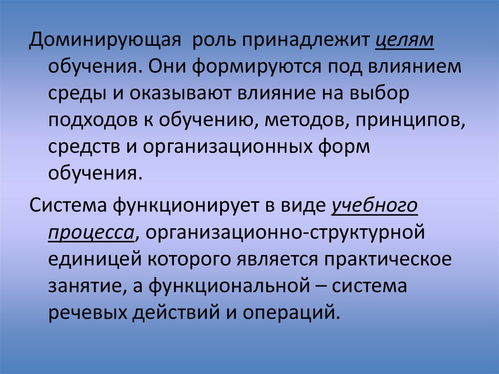 Доминирующая роль принадлежит целямобучения. Они формируются под влиянием