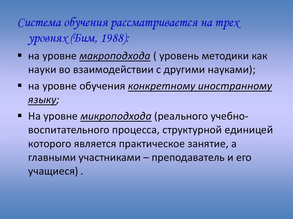 Система обучения рассматривается на трехуровнях (Бим, 1988):