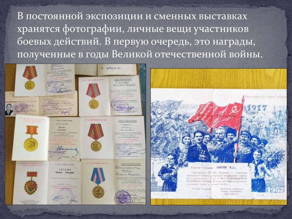 В постоянной экспозиции и сменных выставкаххранятся фотографии, личные вещи участников
