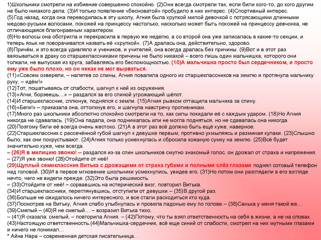 (17)Много раз школьники абсолютно спокойно смотрели на то, как силы покидали её с каждым ударом. (18)Но Агния