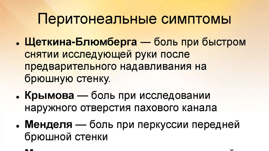 Перитонеальные симптомыЩеткина-Блюмберга ― боль при быстром