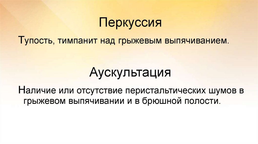 ПеркуссияТупость, тимпанит над грыжевым выпячиванием.