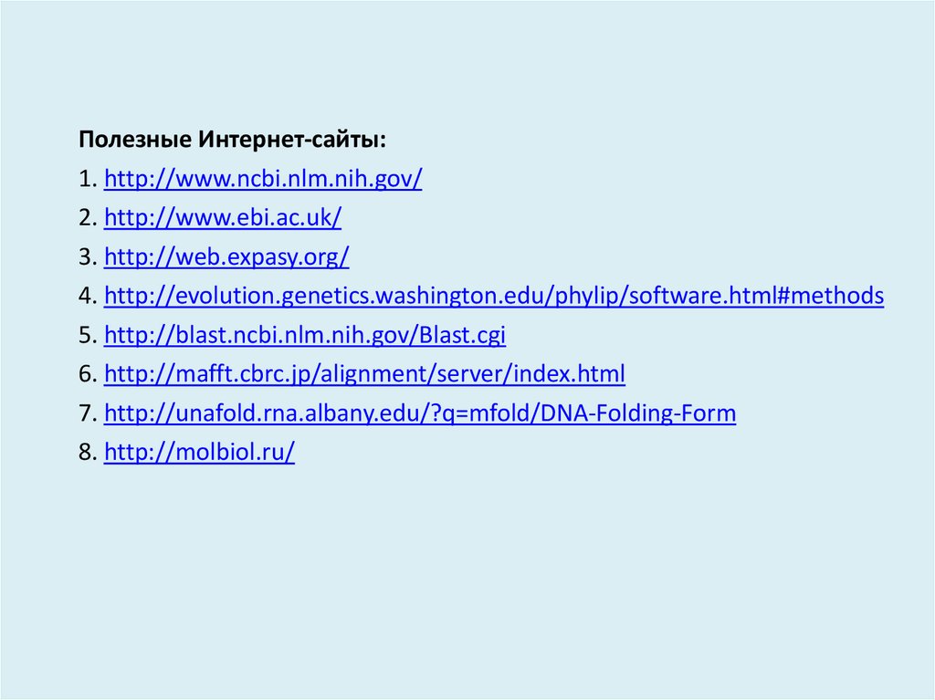 Полезные Интернет-сайты:1. http://www.ncbi.nlm.nih.gov/